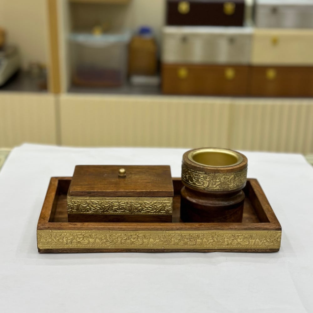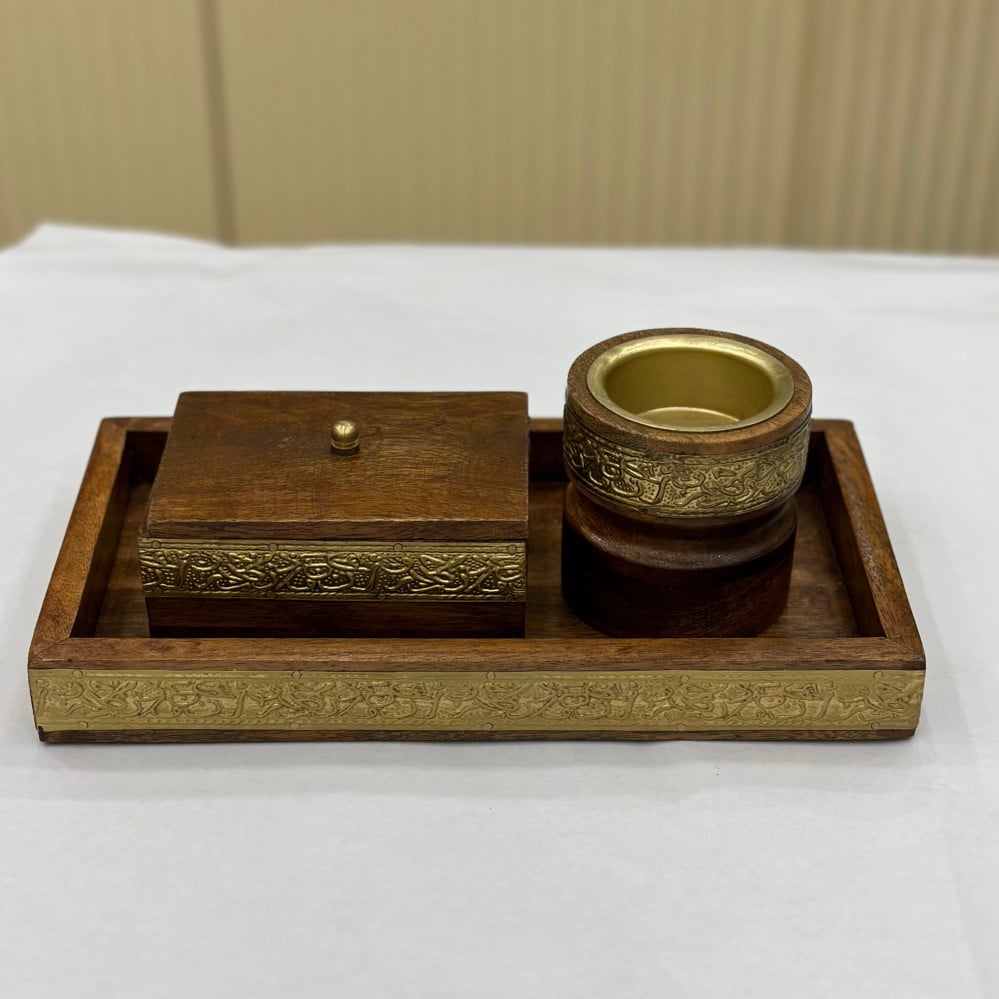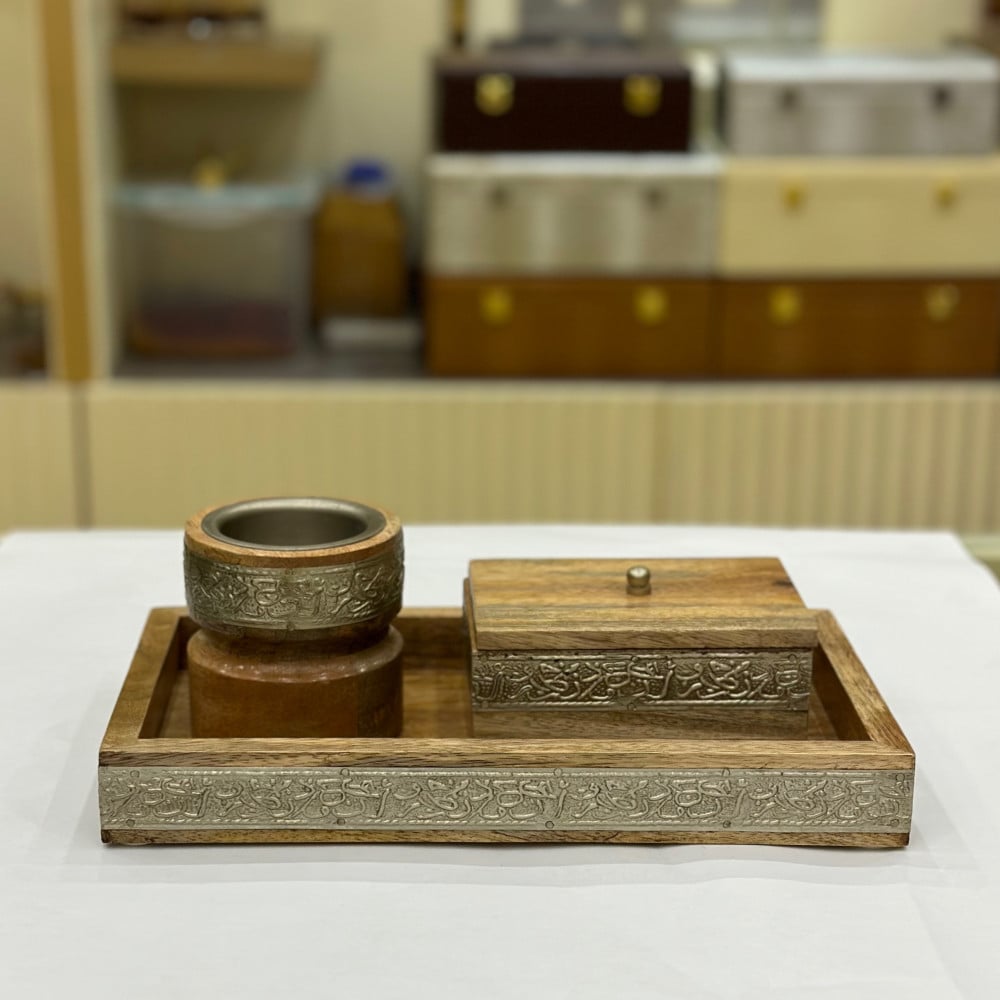 طقم مبخرة خشبية هندية فاخرة تحتوي على طوفرية ومبخرة انيقة وعلبة بخور تتسع لاوقية بخور تقريباً الطول 28 سم العرض 15 سم المقاسات للطوفرية