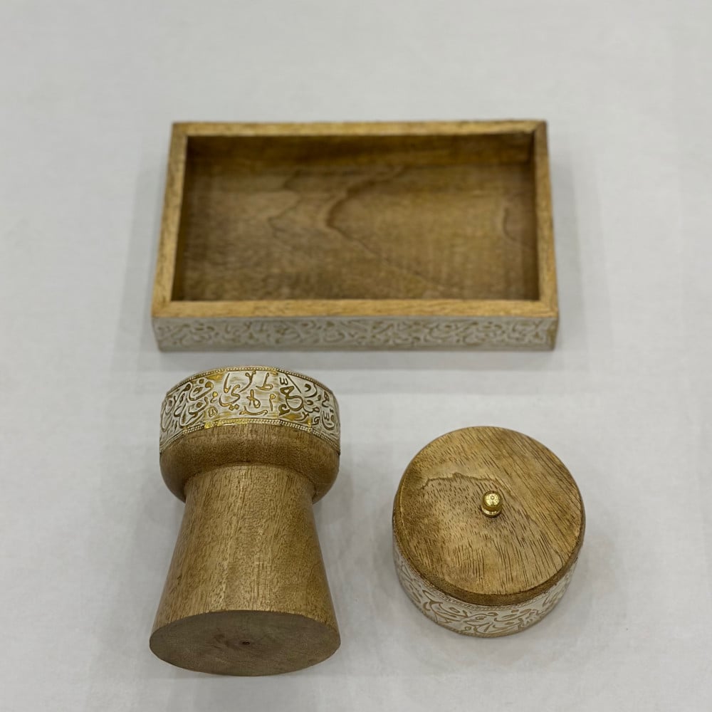 طقم مبخرة هندية خشبي جميل للاهداء والاستعمال يحتوي طوفرية خشبية ومبخرة انيقة وعلبة بخور صغيرة