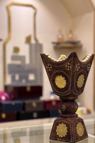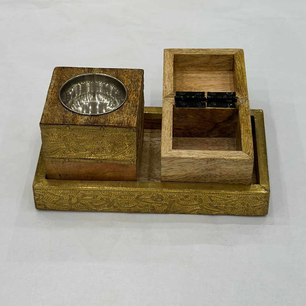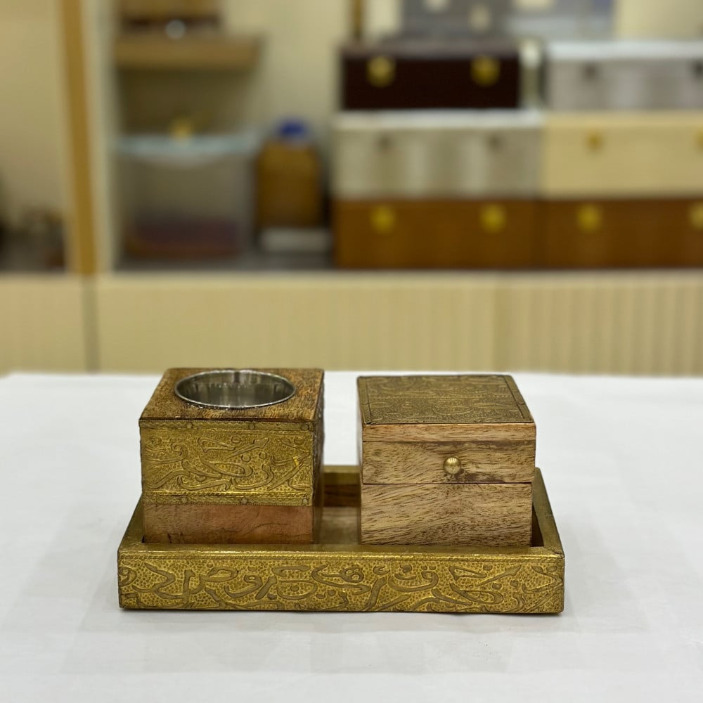 طقم كبخرة هندية خشبية تحتوي على طوفرية ومبخرة مربعة وعلبة بخور تتسع لنصف اوقية الى اوقية بخور الطوله 19 ونصف العرض 11 سم المقاسات للطوفرية