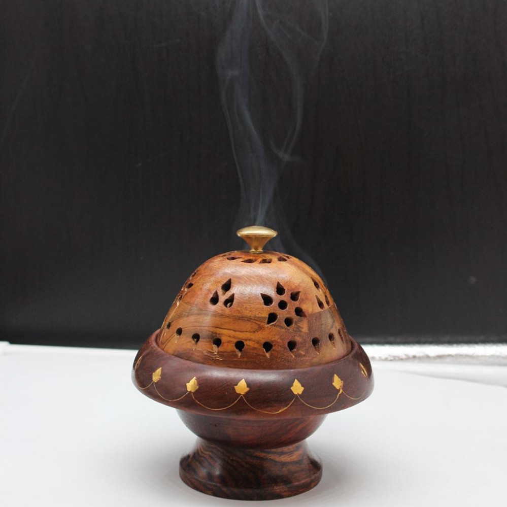 مبخرة هندية صناعة يدوية من الخشب بغطاء جميل الطول 12سم القطر من الوسط 12سم فتحة الجمر 5سم