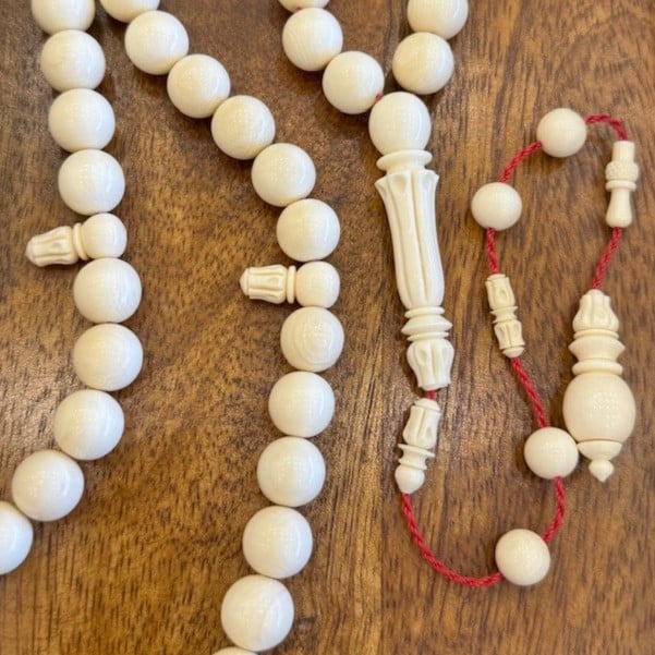 سبحة عاج ناب الفيل الطبيعي بوزن 75 جرام بشاهد وفواصل وتمليكة منقوشة باحترافيه عالية حجم الخرز 11 مل عدد الخرز 55 خرزة