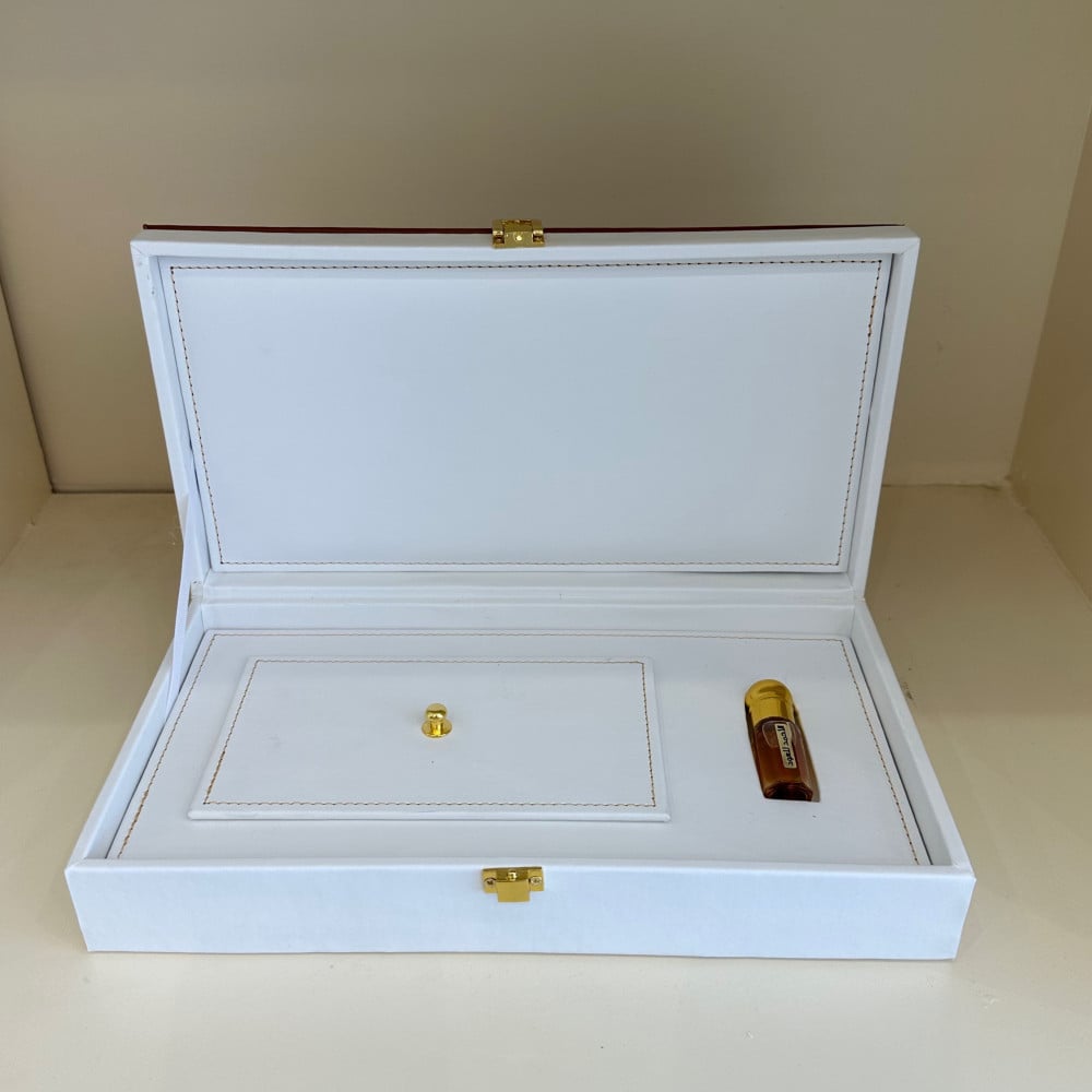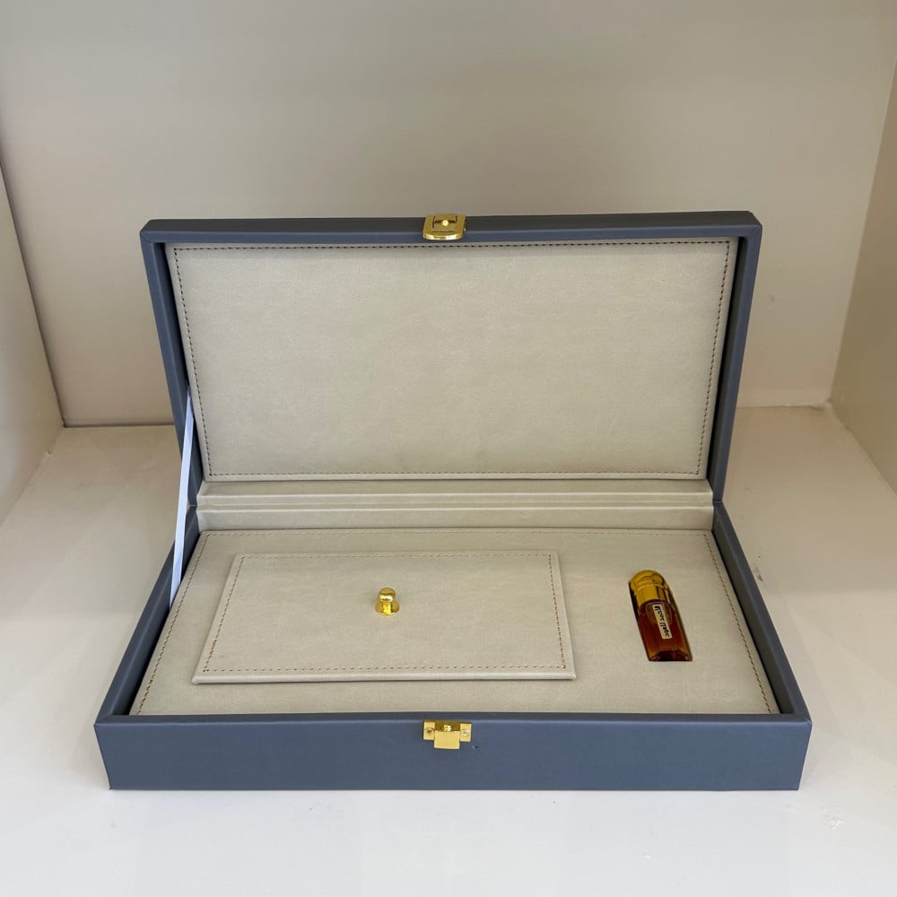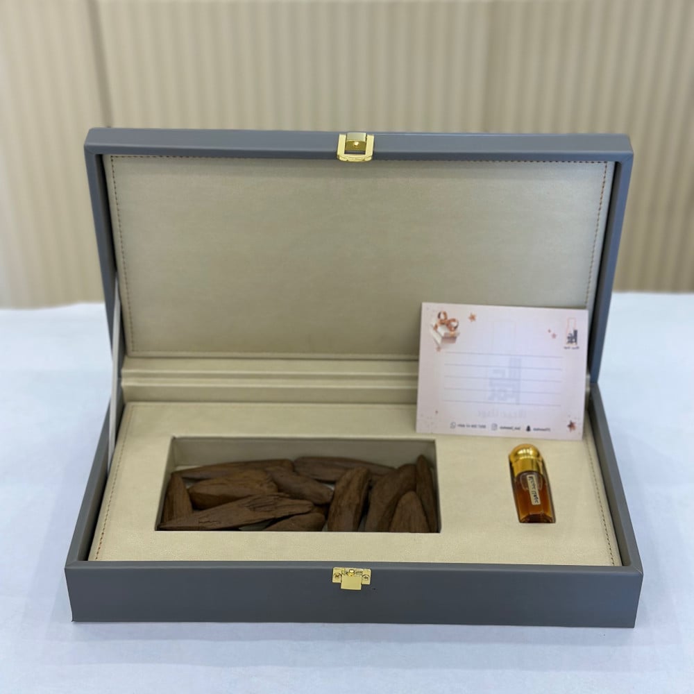صندوق اهداء من الجلد الايطالي يحتوي على ربع تولة من مخلط الاحمد الاكثر مبيعاً بالاضافة الى اوقية ونصف من عود مروكي محسن المناسبات وكرت اهداء جميل