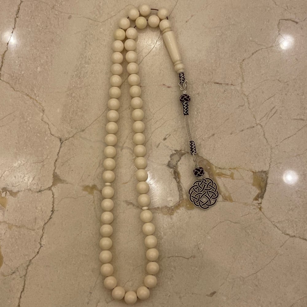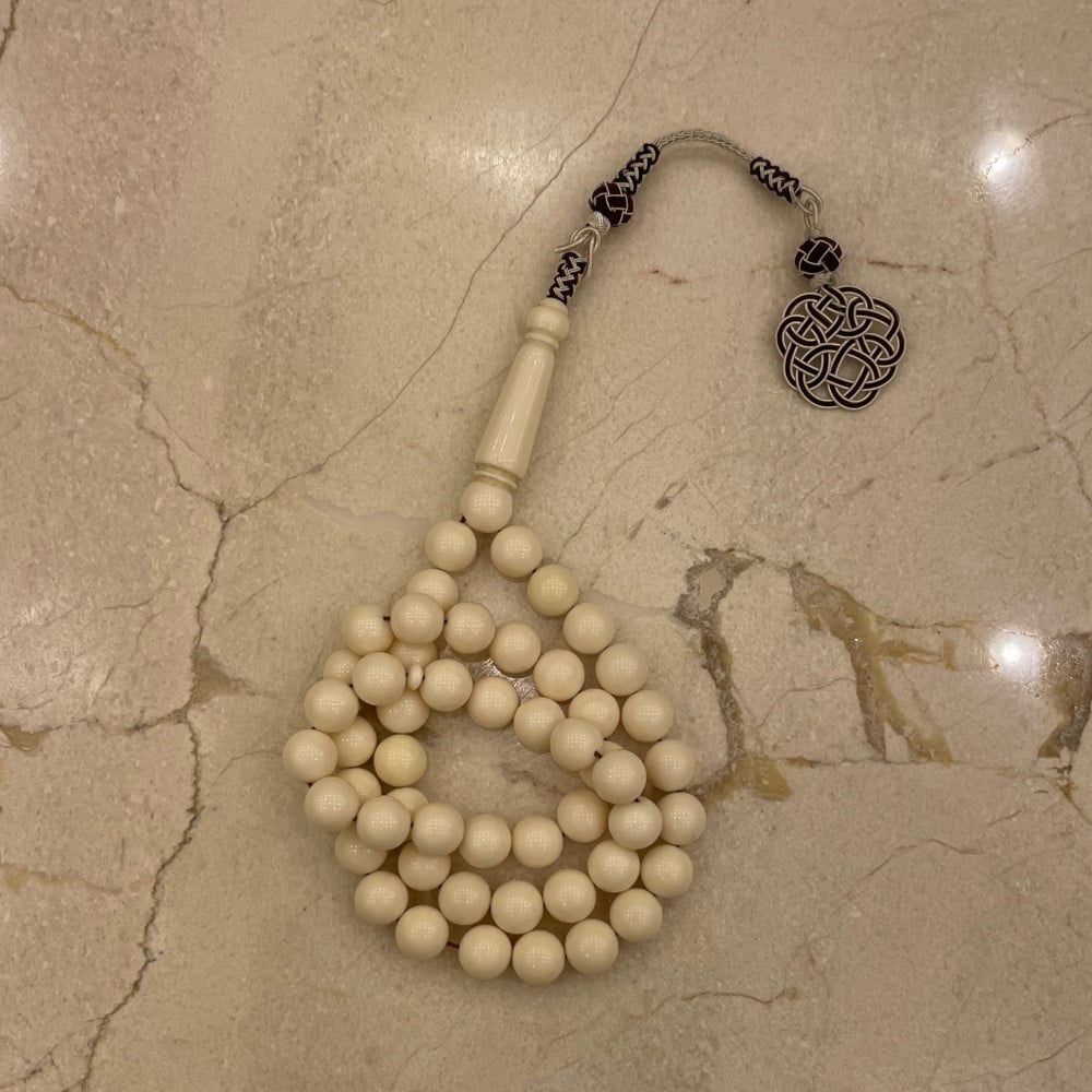 سبحة بكلايت بلون سكري مميز مشابه للون العاج الطبيعي بكركوشة طربزونية (مشابهة للفضة وليست فضة ) عدد الخرز 51 خرزة